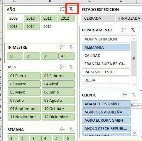 RECUERDE: Los filtros están relacionados entre sí, al filtrar por ejemplo un país se verán marcados los clientes del país, mientras que el resto quedará sin marcar.