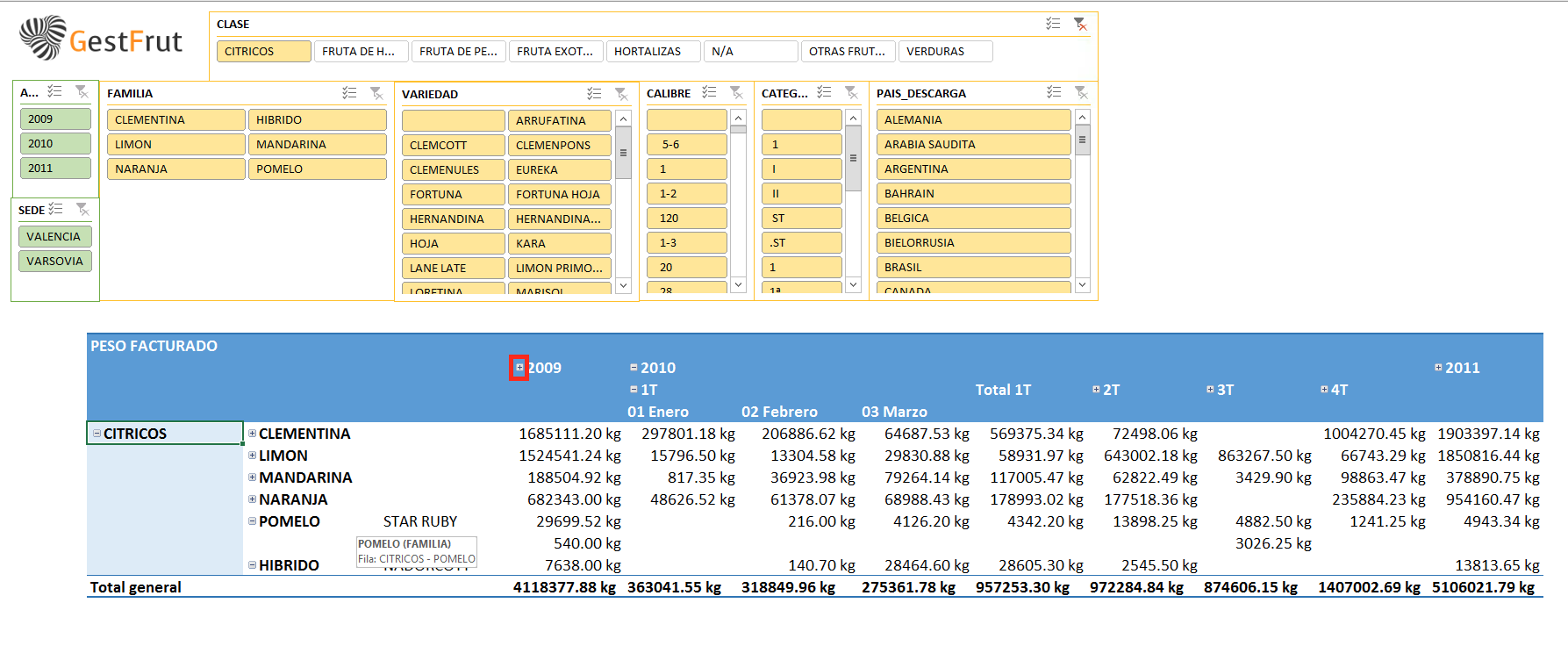 En cada pestaña se puede buscar los resultados por año, mes, semana, clase, familia, variedad, sedes, clientes, provedores, gestor...etc.