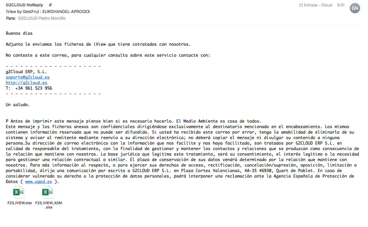Si lo desea, puede recibir todos los días por mail los archivos excel generados el día anterior. El envío se hace en torno a las 05.00 AM, y se puede enviar a varias direcciones de mail. El correo contendrá los archivos del iView que tenga contratados en formato excel.