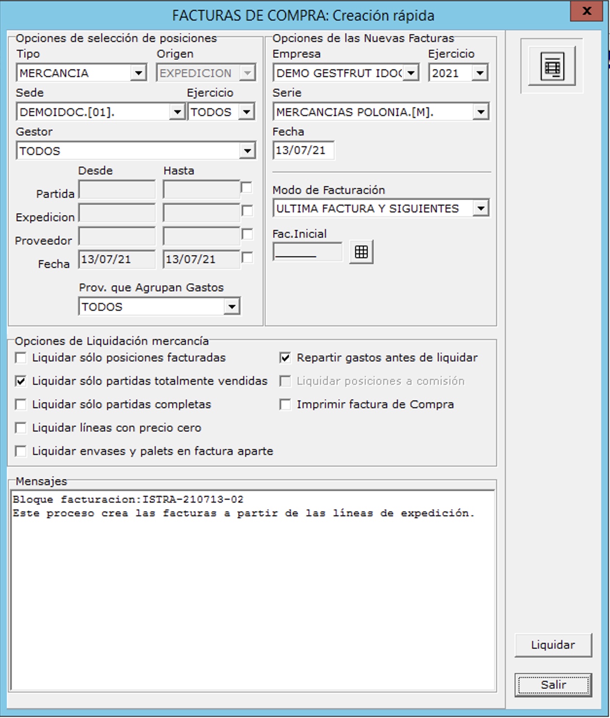Es posible facturar de una vez todas las expediciones pendientes , esto se puede hacer desde Administración/Facturas de Compra/Generación rápida.