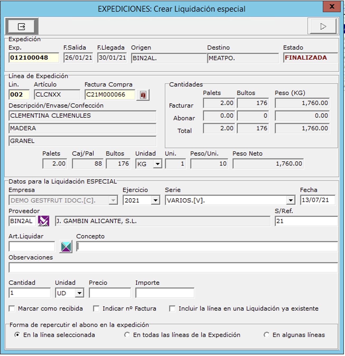 Con el menú Liq.Especiales se pueden hacer cuentas de venta complementarias las opciones disponibles son: Crear/Ver/Vista Previa/Ir a/Eliminar. Para crear un abono se usa la pantalla siguiente: