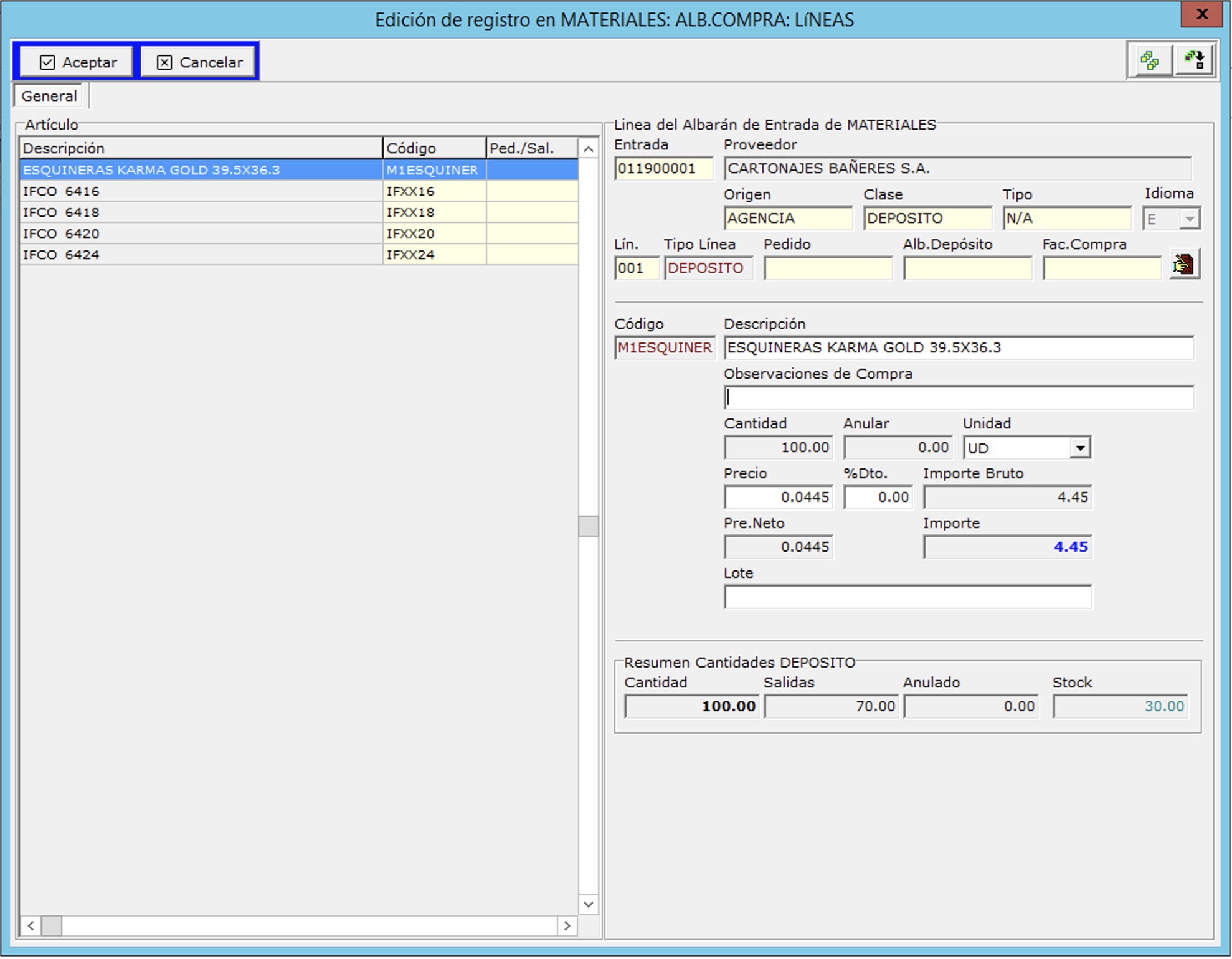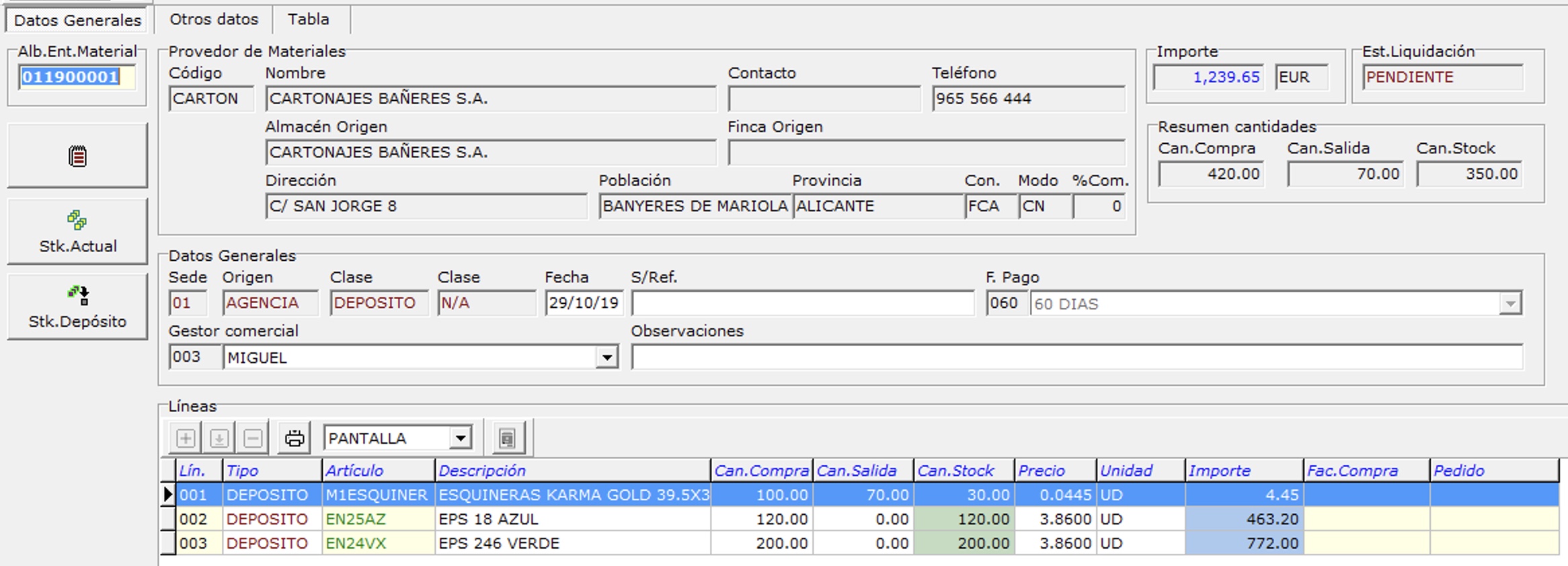 En cada línea del albarán de compra podremos indicar el material , cantidad, unidad, precio, descuento, número de lote, etc.