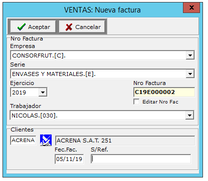 Para crear la factura de venta usamos Administracion/Facturas de Venta seleccionando la serie E.