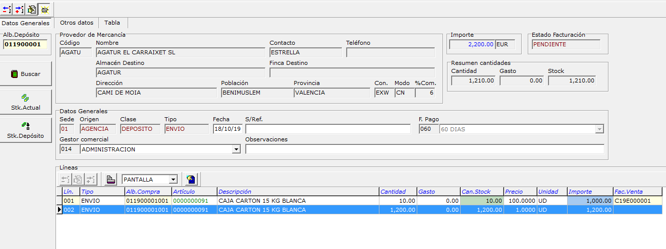 Los albarans de depósito se marcarán con el número de factura de venta, cuando todas las líneas estén facturadas el estado será FACTURADO.