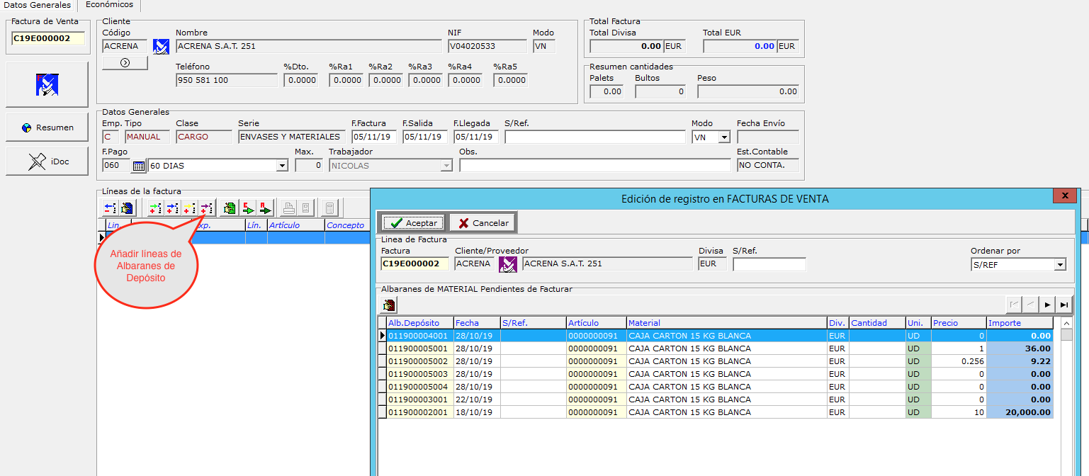 Los Albaranes de compra de materiales se pueden asociar a una factura de compra de un proveedor de materiales (para hacer el pago), y los albaranes de materiales de depósito se pueden facturar al proveedor de mercancía (para hacer el cobro).