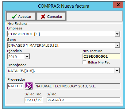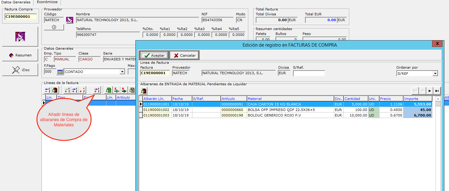 Los albaranes de compra de materiales se pueden facturar por líneas para registrar la factura de compra del proveedor de materiales. Para ello debe usar Administración/Facturas de Compra/Mantenimiento y agregar una nueva factura, seleccione el proveedor y la serie E de ENVASES.
