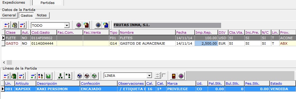 En la pestaña gastos se indican los fletes y gastos asociados a la partida. Se permiten gastos manuales o gastos automáticos. Consulte el apartado gastos para más información.