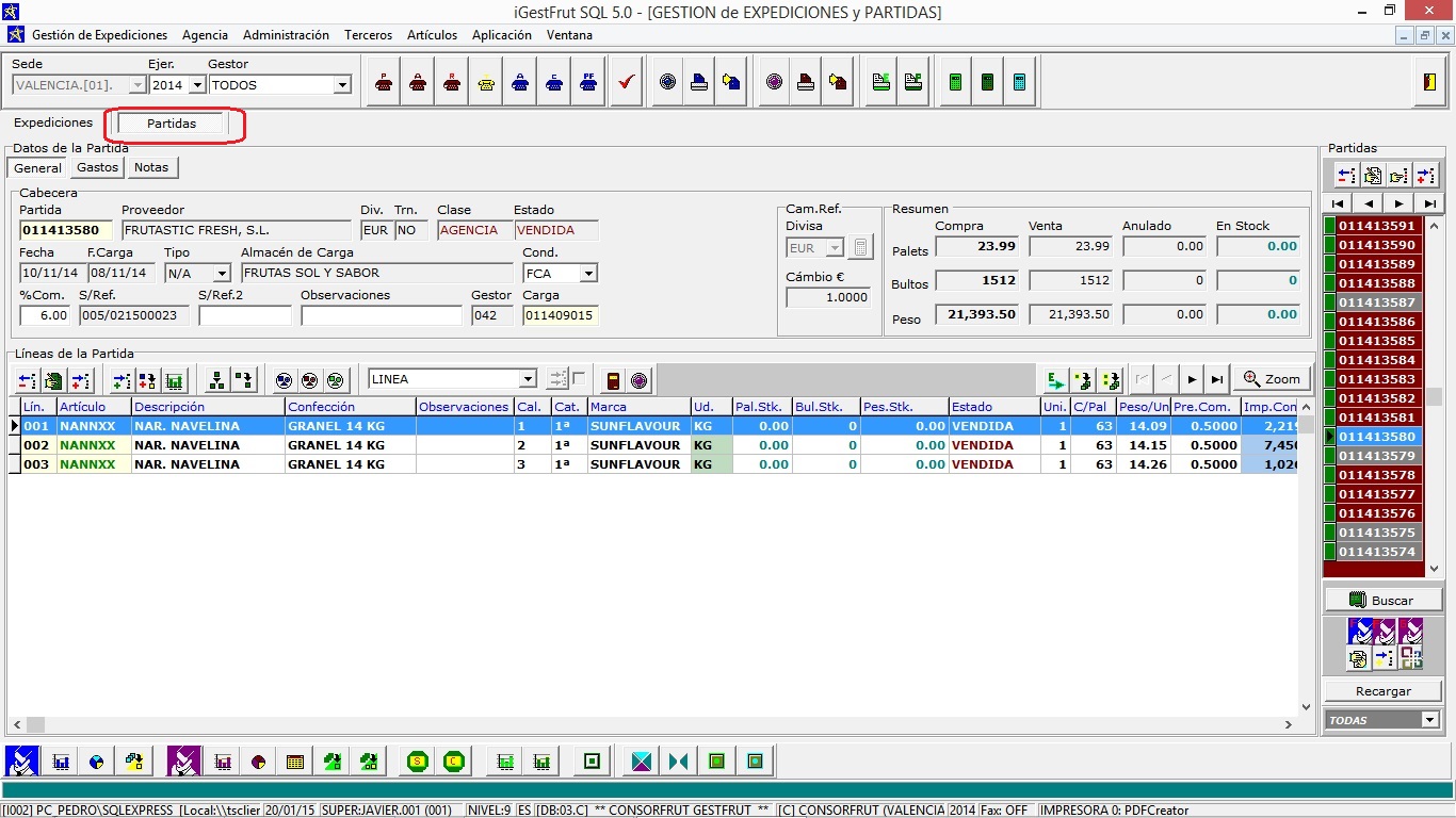 Las partidas se muestran en la lista de la derecha, se pueden filtrar por sede, ejercicio y gestor usando los controles de la parte superior izquierda. Además en la parte inferior, existe un desplegable para filtrarlas según su estado.