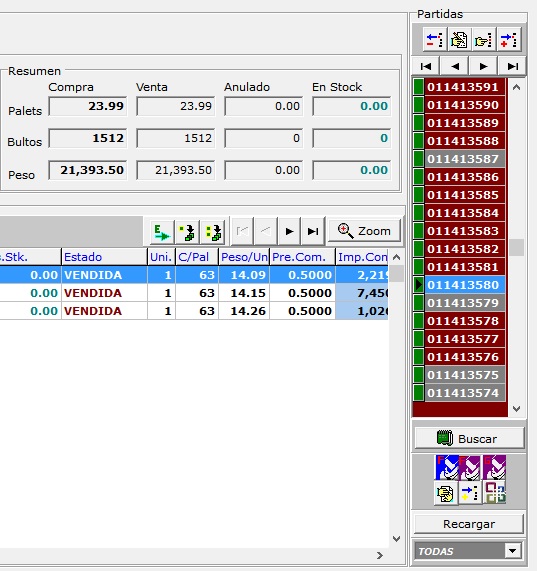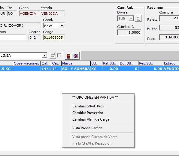 La mayoría de los campos se pueden modificar directamente pulsando el botón editar o haciendo doble click sobre el número de partida. Los campos en gris se pueden modificar usando el botón derecho sobre la zona de las líneas, es el caso por ejemplo del proveedor o su número de albarán en caso de que en la carga se haya cometido un error al hacer la carga.