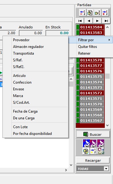 Situando el ratón en la lista de partidas y haciendo click con el botón derecho se muestran las opciones de filtrado. Estas opciones se pueden encadenar, lo que permite por ejemplo buscar partidas de un proveedor, un producto, etc.
