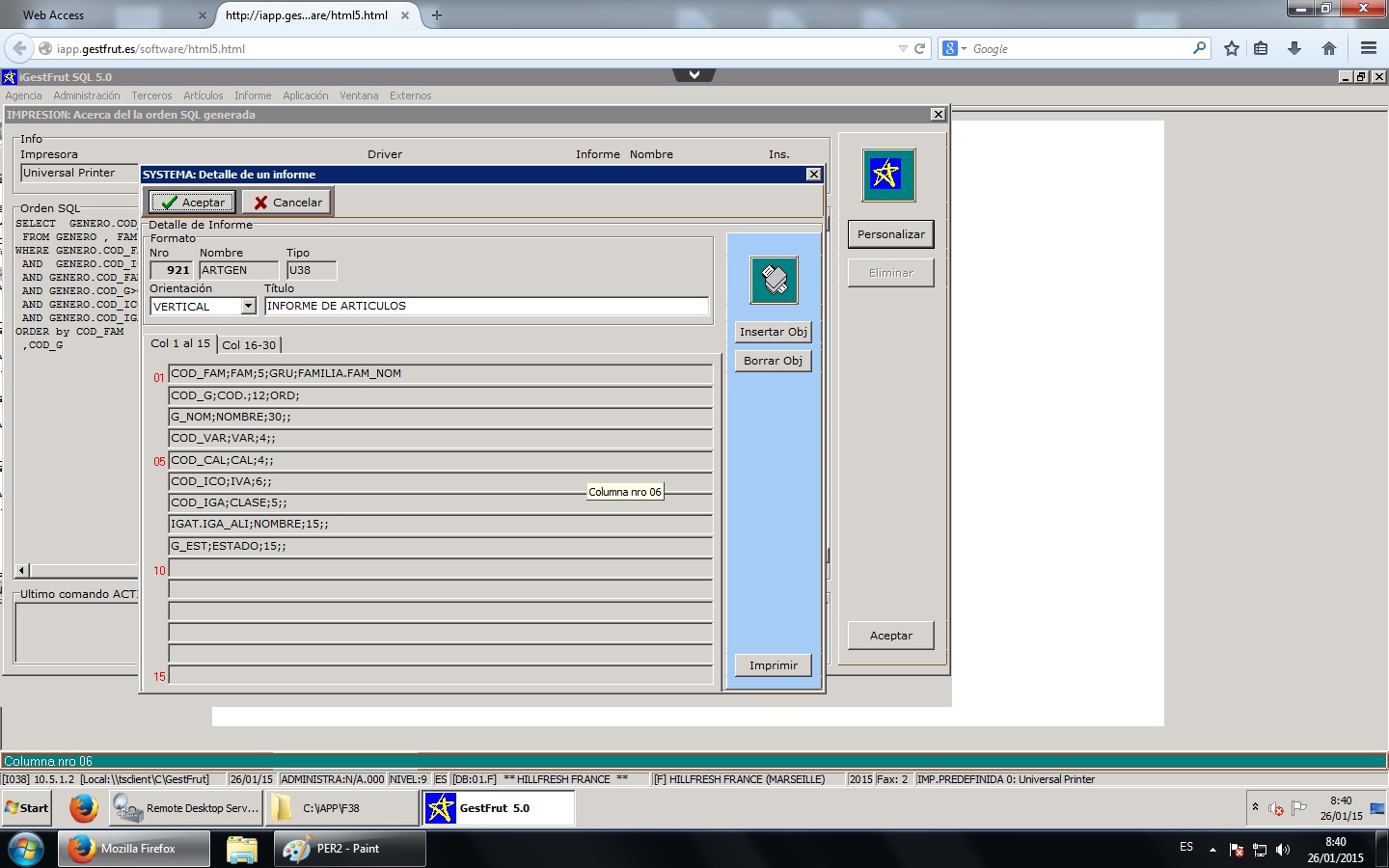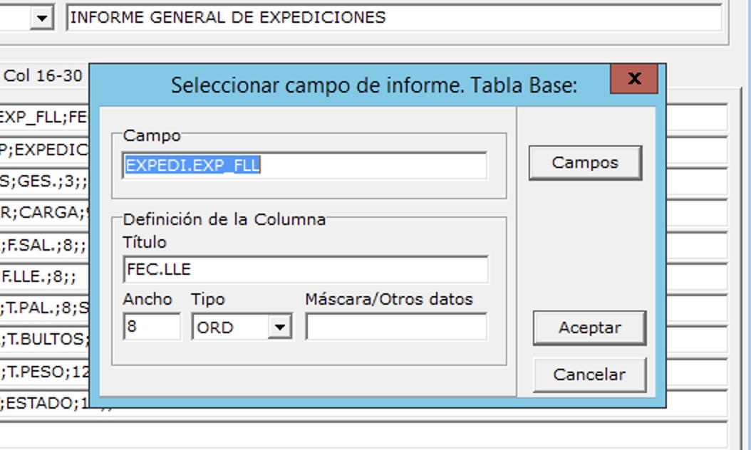 Puede cambiar el título y la orientación del informe haciendo doble clic en campos puede cambiar la definición de cada columna: campo, título, ancho, etc.