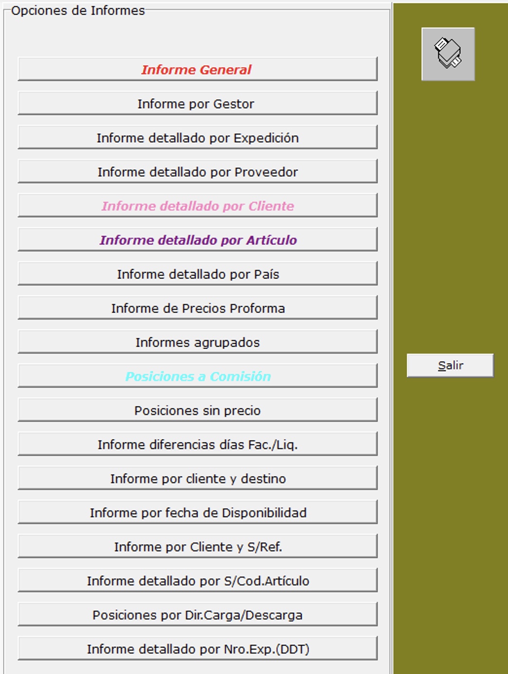 La aplicación tiene más de 80 tipos diferentes de documentos: avisos al proveedor, aviso al cliente, aviso al transportista, factura, ventas de cuentas, etc. Además, más de 900 informes están disponibles de todo tipo. El usuario tiene la posibilidad de personalizar algunos elementos de estos documentos e informes..