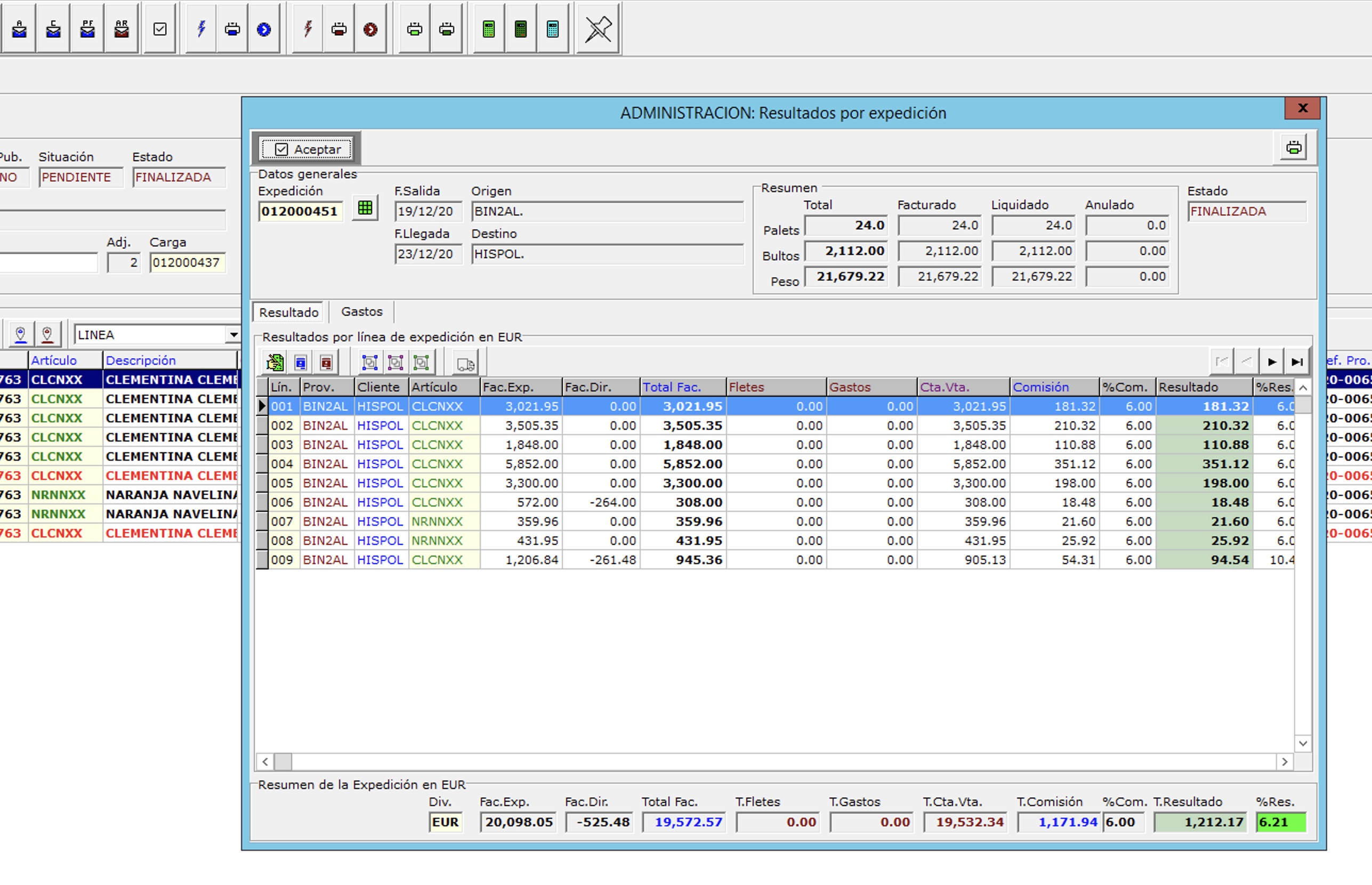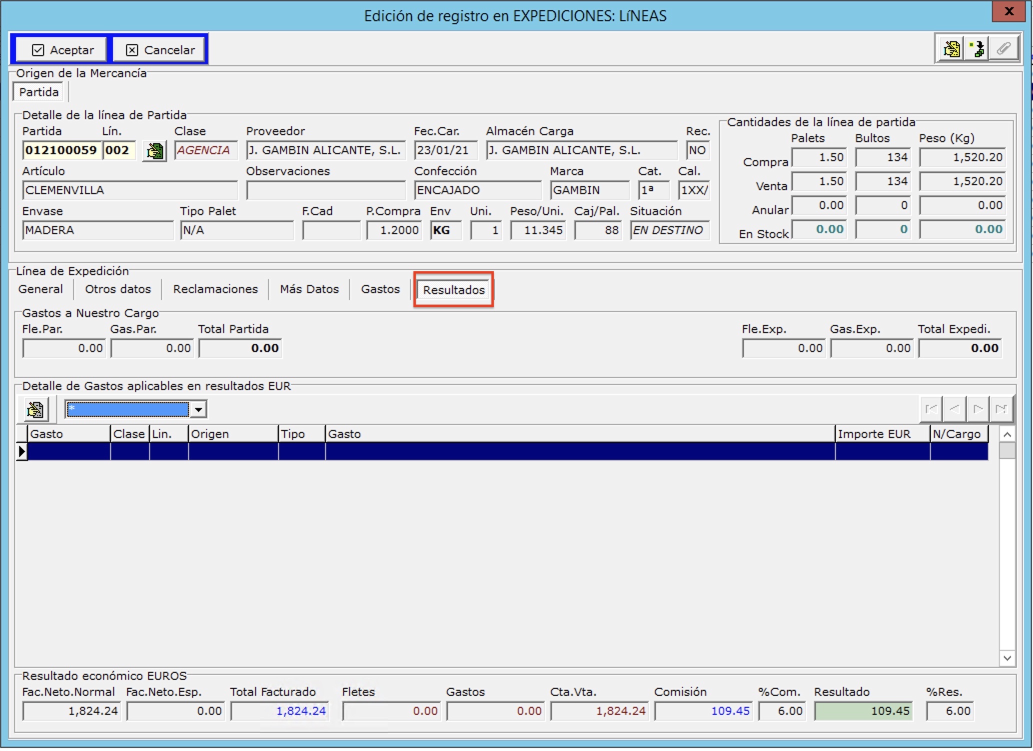 Puesto que los resultados se repercuten en cada línea de expedición, se pueden comprobar en la pestaña resultados de la línea de la expedición.