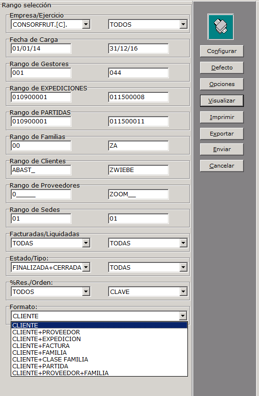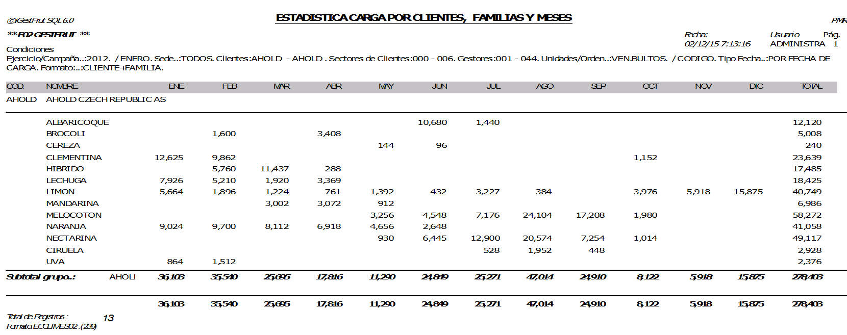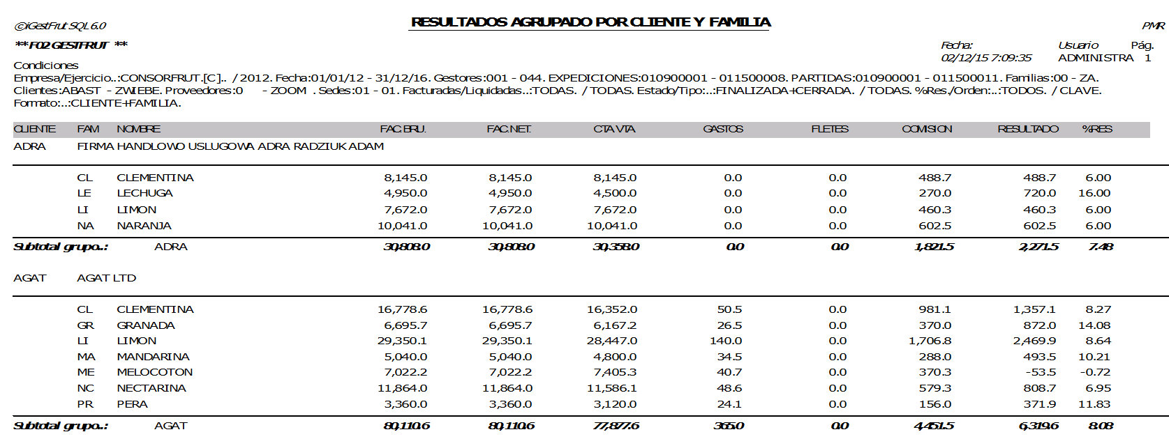 Todos los informes de resultados tienen las mismas columnas, que coinciden con la pantalla de resultados por expedición, por ejemplo un informe de resultados por cliente y familia tiene este aspecto.