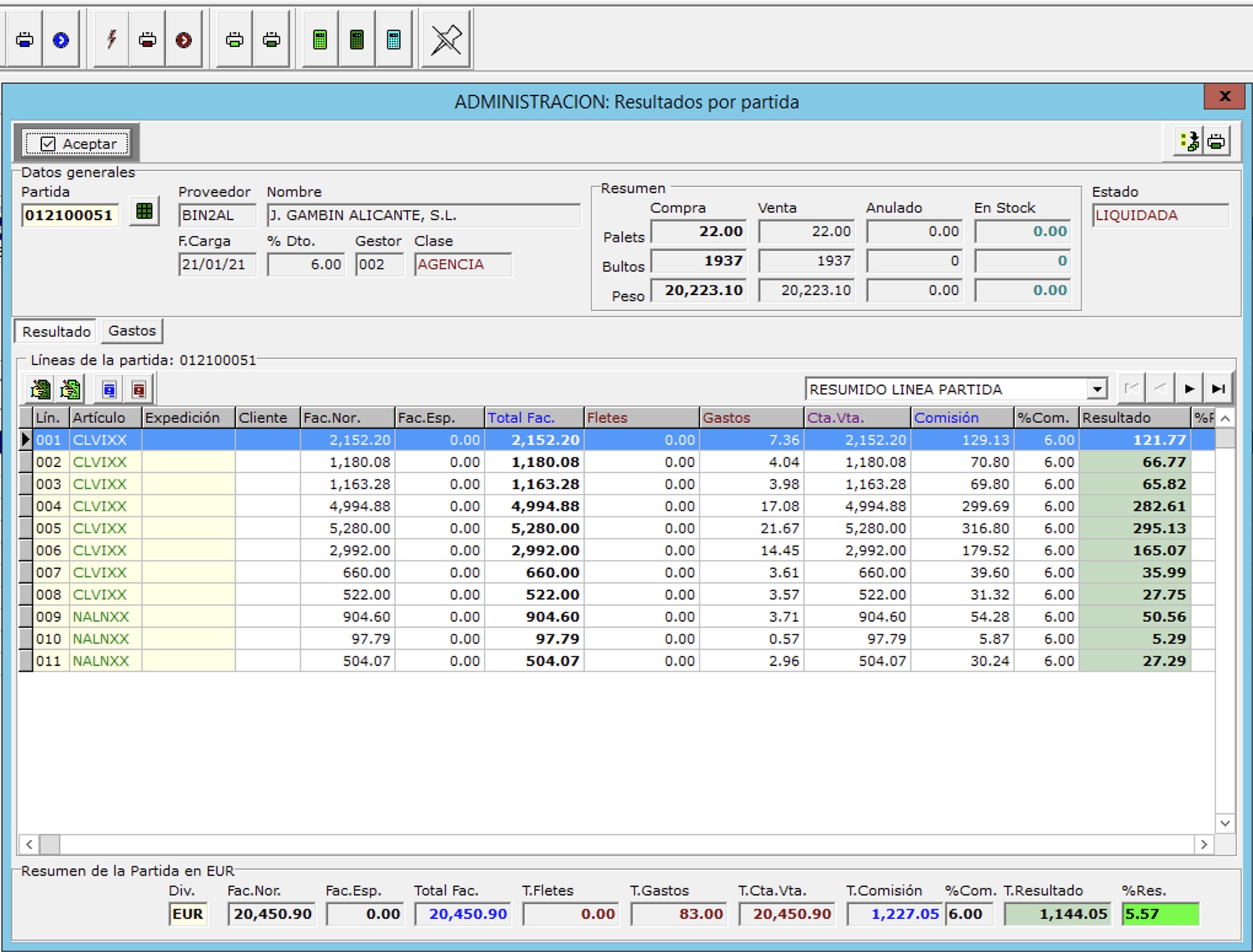 Este botón se suele usar en instalaciones donde se gestiona stock en almacén regulador y una partida se vende en múltiples expediciones, en este caso el resultado de partida muestra el margen obtenido en la compra.
