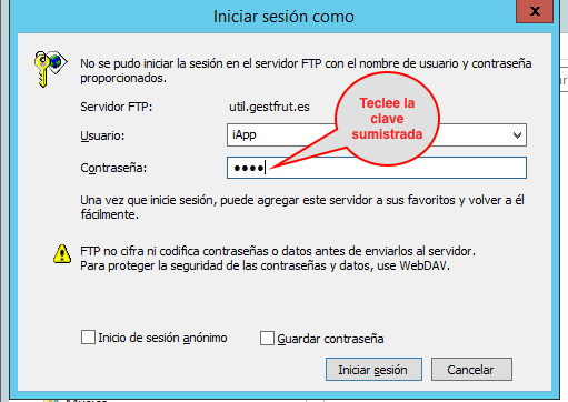 Al hacer click sobre el FTP debe mostrar esta pantalla, donde se deberá indicar el usuario: iapp y contraseña: 2019.