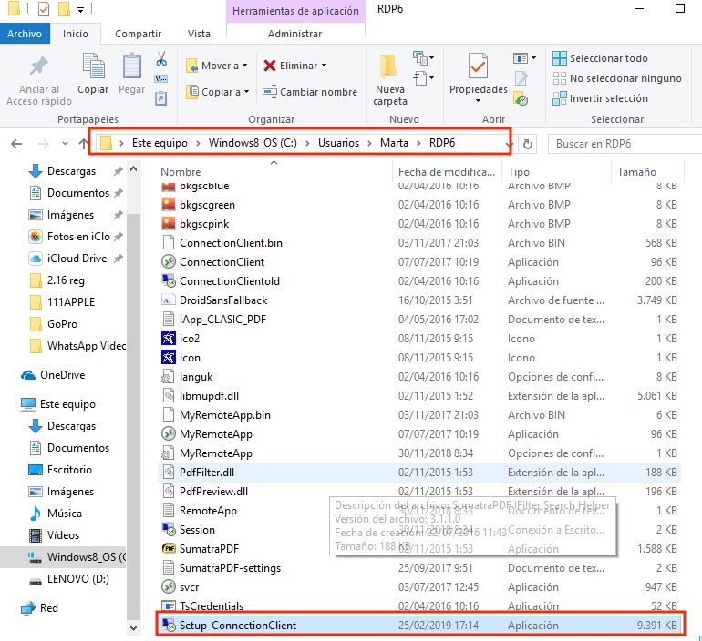 Si el equipo ya se conectaba con una versión anterior de TSPLUS deberá descargar el archivo SETUP-CONNECTIONCLIENT en la carpeta : Equipo/ Usuarios/NOMBREUSUARIO/RDP6. El archivo .connect lo puede dejar en el escritorio.